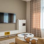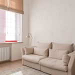 Skandynawska kawalerka z panelami akustycznymi, duży dywan i ciężkie zasłony w beżowej tonacji